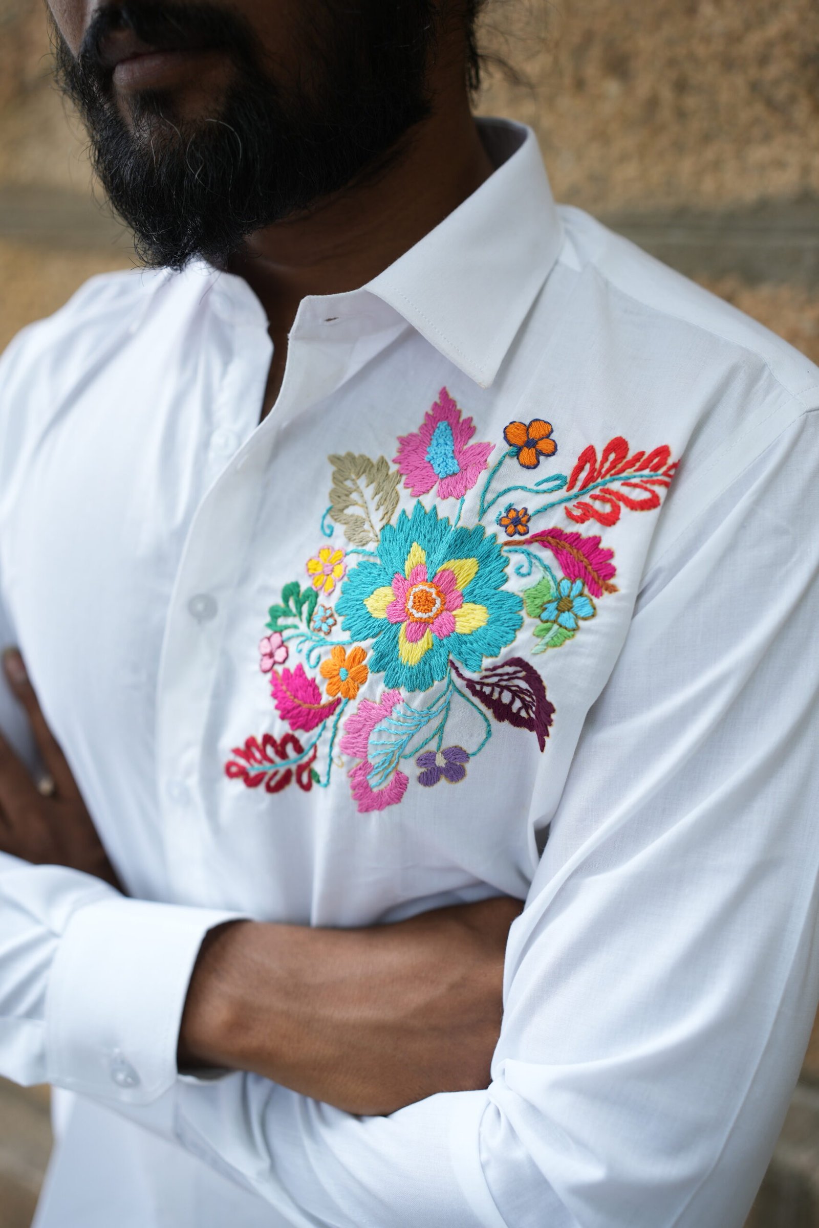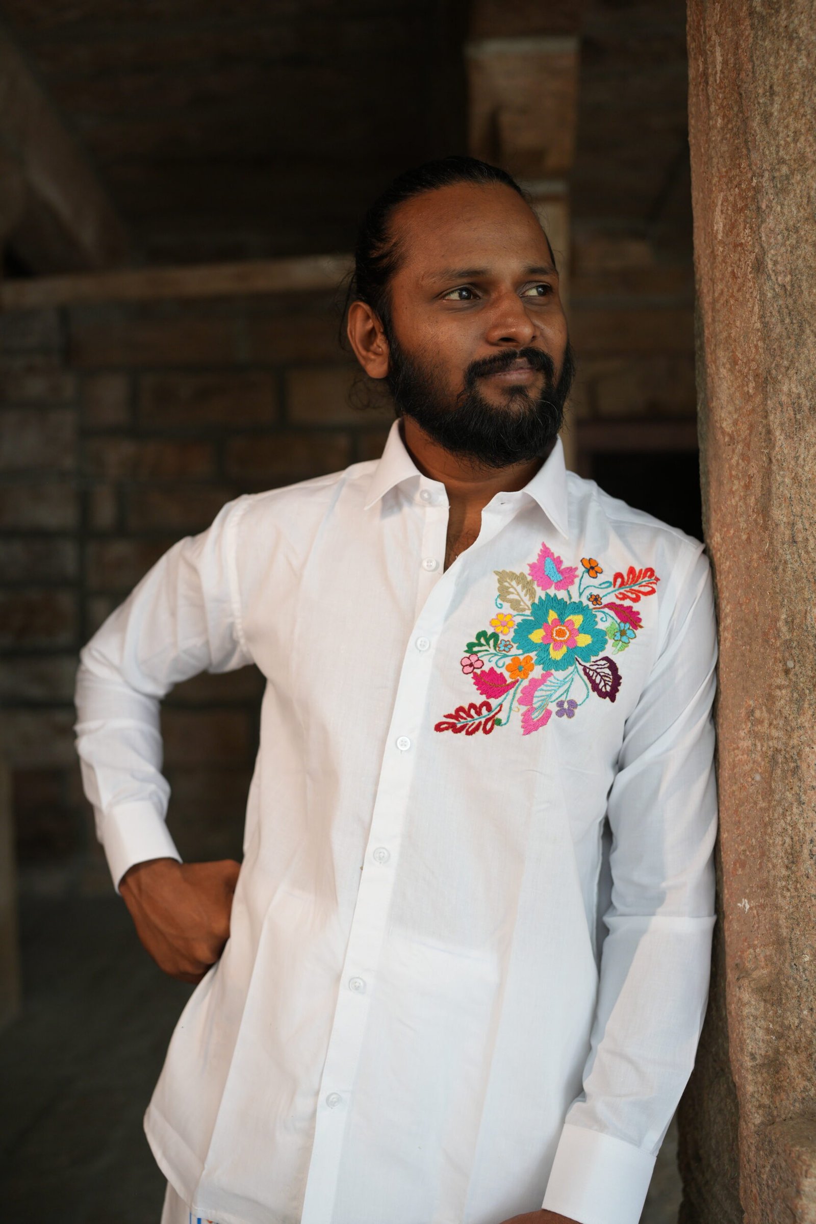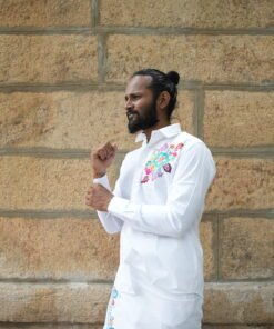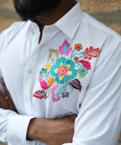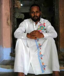 Celebrate in style with our Weaver’s Dream Floral Ensemble – a vibrant 100% cotton embroidered shirt paired with a comfy single-layer dhoti. Features include Velcro fastening, a zip pocket, and a customisable fit for every festive occasion.